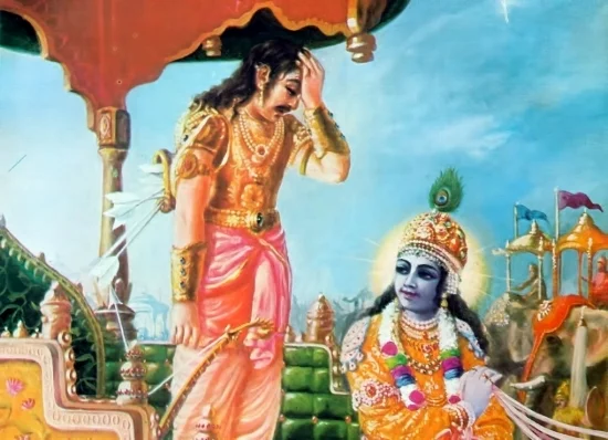 Arjuna loses composure just before battle and questions his own purpose leading Krishna to impart the wisdom of yoga in the Bhagavad Gītā.